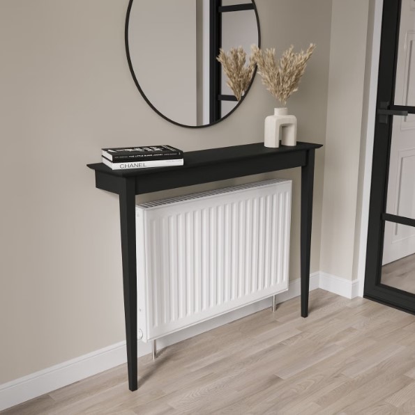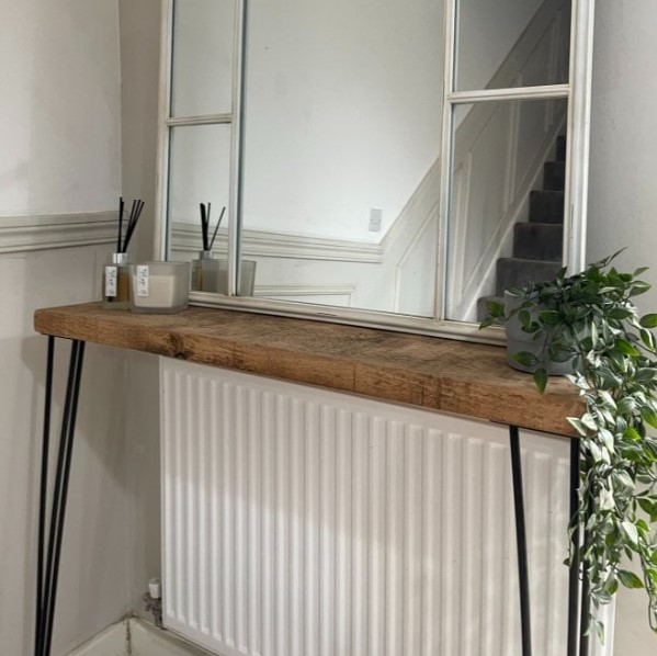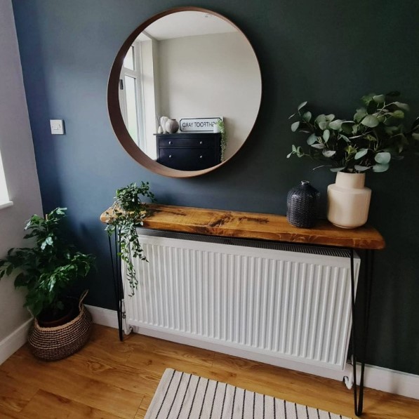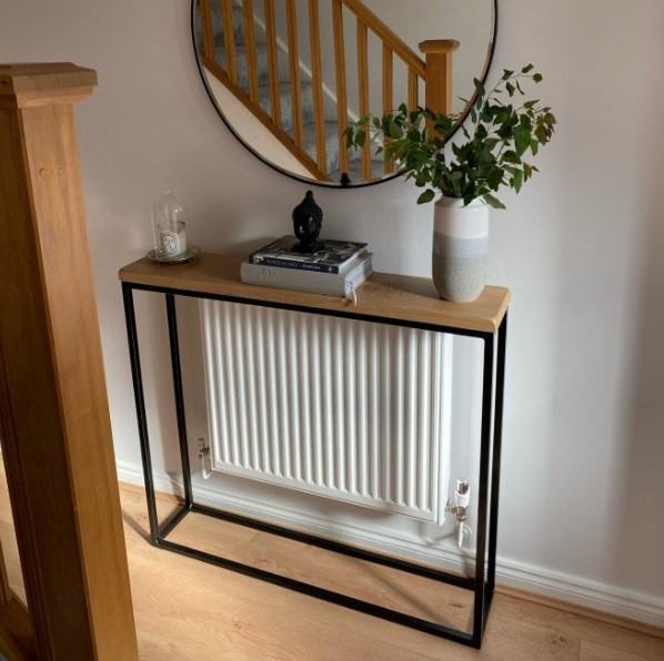 Rustik görünümlü ahşap üst kısma sahip olan kalorifer üstü dresuar modelleri, şık siyah metal çerçeveleriyle modern bir görünüm sunmaktadır. Bu dresuarların ince ve kompakt tasarımı, özellikle dar alanlar için mükemmeldir.
